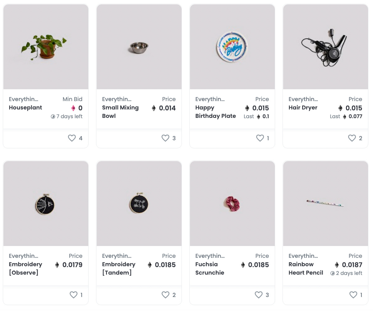 An artist who goes by Stardrop recently photographed all of their 1,026 worldly possessions and turned them into a NFT project called “Everything I Own,” including a houseplant, a hair dryer, and a container of mustard. The project quickly sold out its entire original mint. The photos are compelling on their own, but I think it’s even better because it takes advantage of the particular strengths of NFTs. By photographing the objects, the artist turns them into a unique catalogue, in a similar way to blockchain entries. The project makes logical sense as a group of items, which certainly can’t be said of all NFT drops.