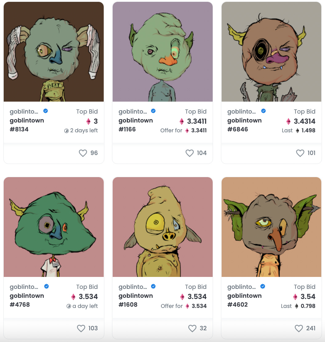 Sometimes nothing makes sense. Goblintown was a recent, classic 10k avatar NFT drop from anonymous creators that was initially free to mint but has since turned over $32 million in resales. Why was it so successful? It promised no roadmap or eventual Metaverse video game. There are probably insiders and influencers behind it; some people speculated it was the work of Bored Ape Yacht Club. Its website is certainly high production value and the art is charmingly abject.